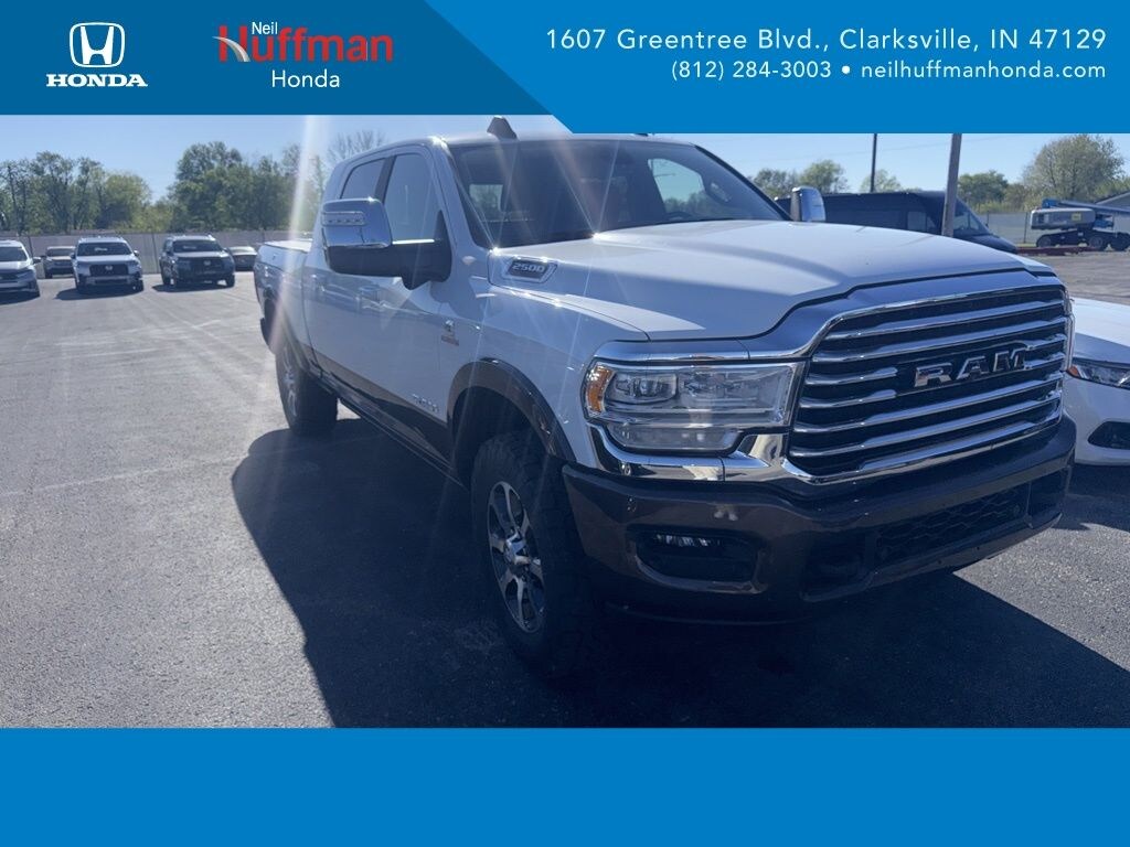 Recent Arrival! CARFAX One-Owner. 2023 Ram 2500 Longhorn 4D Mega Cab Bright White Clearcoat 4WD Cummins 6.7L I6 Turbodiesel 6-Speed Automatic *LOCAL TRADE IN*, *LOW MILES*, *4 WHEEL DRIVE / 4X4*, *NAVIGATION*, *ALLOY WHEELS*, *8.4 INCH TOUCHSCREEN DISPLAY*, *APPLE CARPLAY/ANDROID AUTOPLAY*, *BLUETOOTH*, *REAR BACK UP CAMERA*, *PUSH BUTTON START*, *DUAL-ZONE AUTO TEMP CNTRL*, *LEATHER SEATING*, *HEATED FRONT SEATS*, *LANE DEPARTURE / KEEPING WARNING SYS*, *BLIND SPOT ASSIST*, *FWD COLLISION WARNING SYS*, *AUTO TRANS*, *ASK ABOUT OUR LOW FINANCING OPTIONS*, ** 3 YEARS COMPLIMENTARY MAINTENANCE **, *HUFFMAN PLATINUM PLAN WARRANTY INCUDED*, 12" Touchscreen Display, 17 Speaker harman/kardon Premium Sound, 4G LTE Wi-Fi Hot Spot, Alexa Built-In, Apple CarPlay, Blind Spot & Cross Path Detection, Center Stop Lamp w/Cargo View Camera, Connected Travel & Traffic Services, Connectivity - US/Canada, Disassociated Touchscreen Display, For Details, Visit DriveUconnect.com, For More Info, Call 800-643-2112, Global Telematics Box Module (TBM), Google Android Auto, GPS Antenna Input, GPS Navigation, HD Radio, Integrated Voice Command w/Bluetooth, LED Bed Lighting, Longhorn Level 1 Equipment Group, MOPAR Spray In Bedliner, Navigation System, Off-Road Information Pages, Power Deployable Running Boards, Quick Order Package 2HK Longhorn, Radio: Uconnect 5 Nav w/12.0" Display, Ramcharger Wireless Charging Pad, Selectable Tire Fill Alert, SiriusXM Radio Service, SiriusXM w/360L, Surround View Camera System, Towing Technology Group, Trailer Reverse Guidance, Trailer Tow Pages.